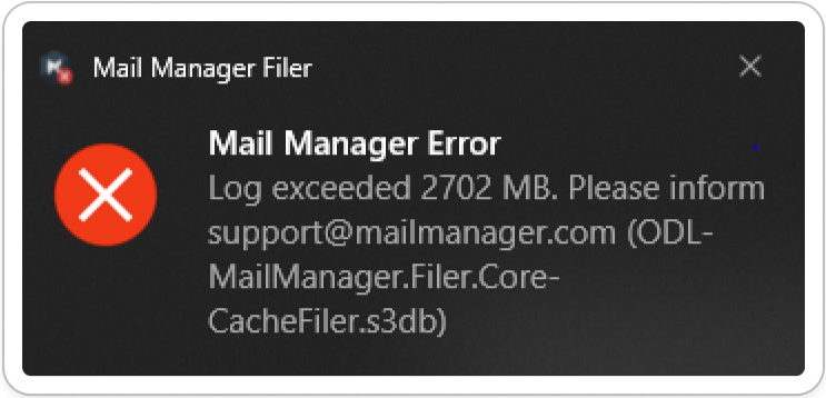 Troubleshooting the "Log exceeded XXXX MB. (ODL-MailManager.Filer.Core-CacheFiler.s3db)" error