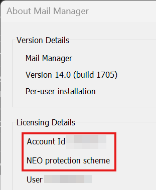 - If the 'About Mail Manager' information shows a valid license with the account id showing there and Mail Manager is functioning normally, users can be be assured that that this is normal and that they are licensed.