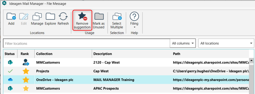 In the Mail Manager filing prompt, there is an option to remove a location suggestion as shown in the screenshot below: