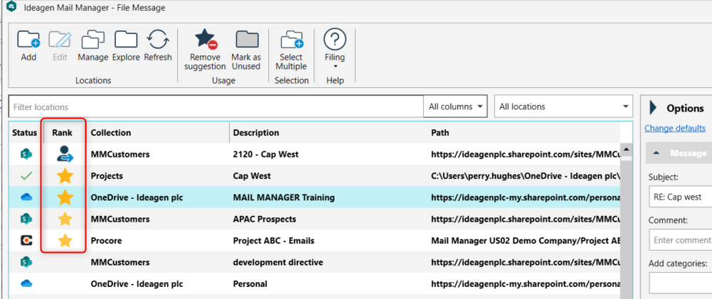 When you file your emails, Mail Manager will attempt to suggest most likely filing locations based on your historic filing, along with some additional data points.
