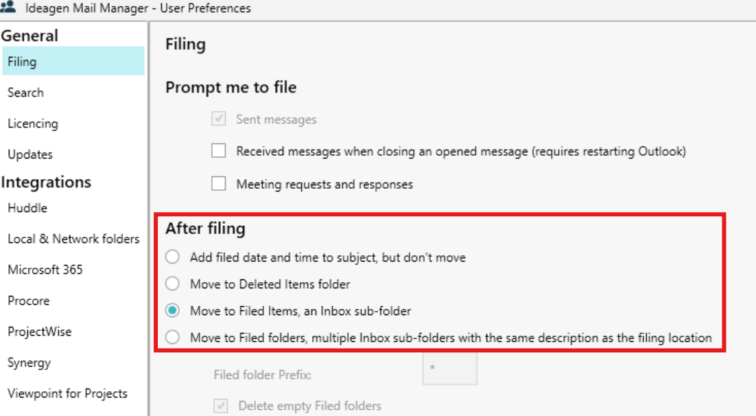 - Look at the After filing options to see what emails are configured to do after they have been filed.