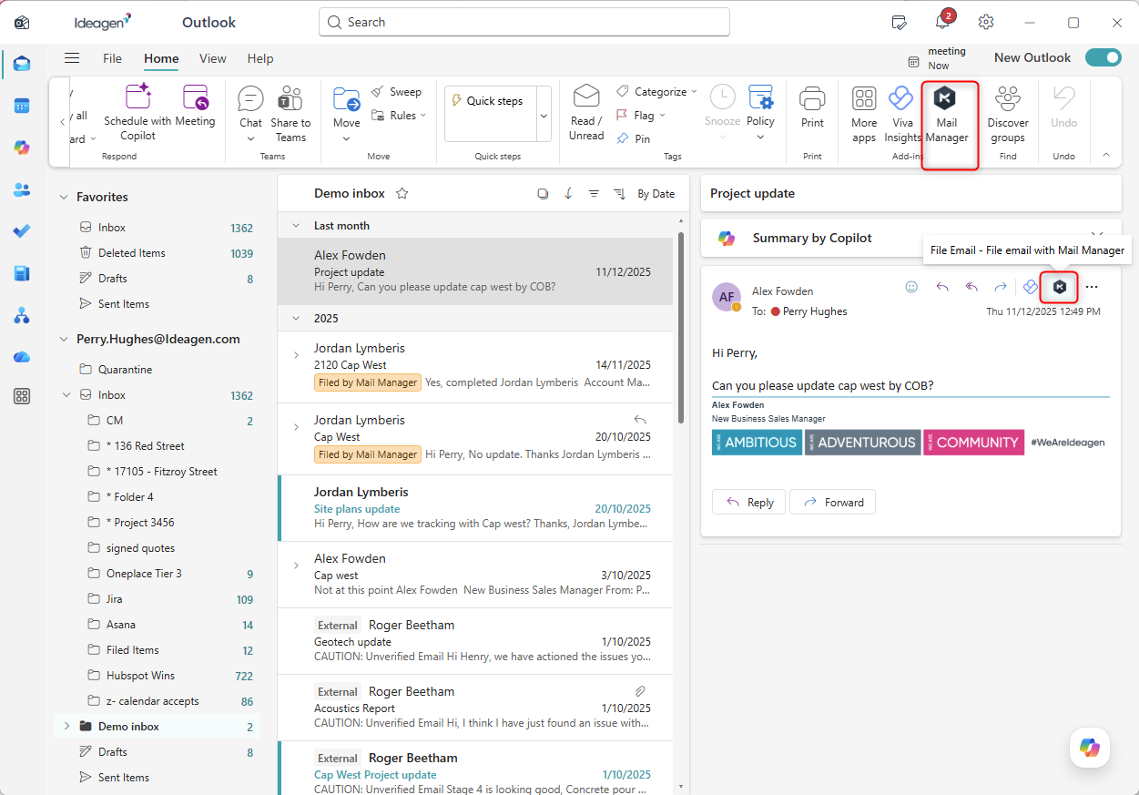 Just like Mail Manager in classic outlook you can drag and drop to file emails using the filed folders after filing setting.