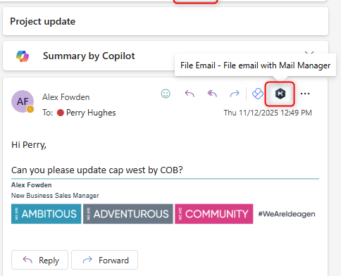 - Or select an email in your mailbox and click on one of the below Mail Manager web add in buttons: